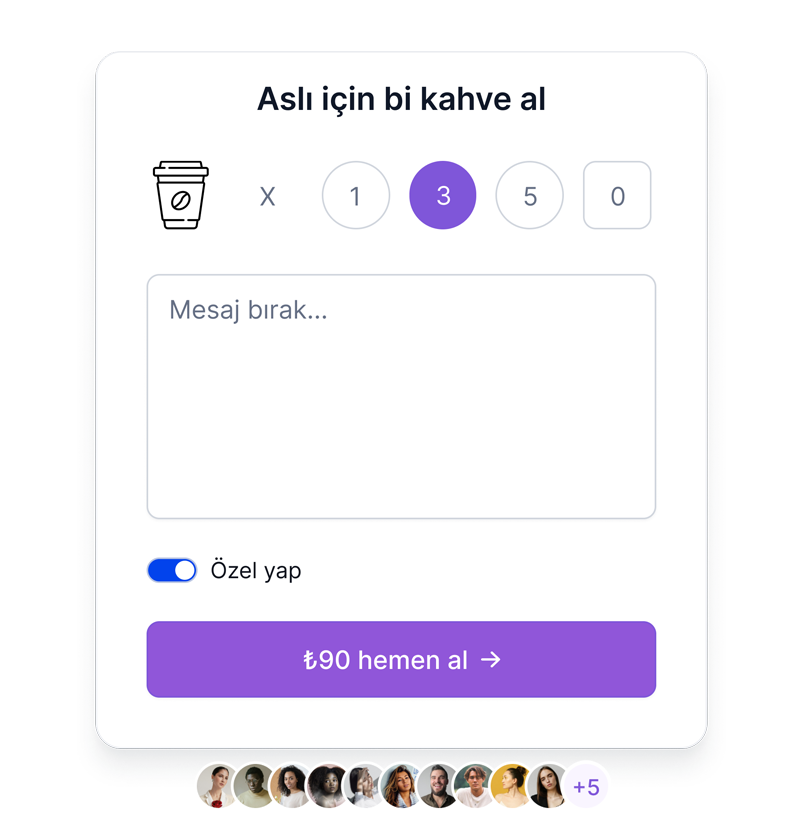 Bikahve.al, işlerinizi takdir eden insanlardan destek ve mesaj almak için eşsiz, eğlenceli ve basit bir yöntem sunar! Bikahveal' ı bir bahşiş kavanozu olarak kullanarak, hayranlarınızın aktivitenize hediye vermesine olanak sağlayabilirsiniz.